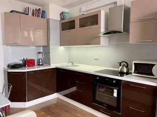 Вариант "заезжай и живи". С мебелью (кухонный гарнитур, встроенный шкаф, диван, кухонный стол, стулья) и техникой (холодильник, варочная поверхность, духовой шкаф, ТВ, стиральная машина , СВЧ, чайник).